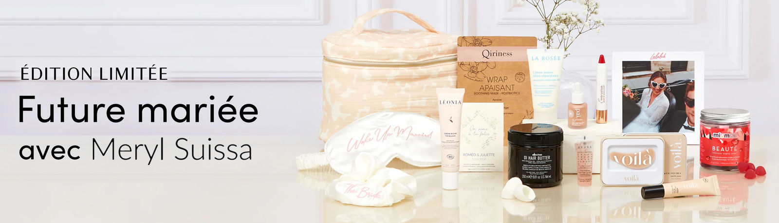 Coffret pour la futur mariée, à s’offrir ou à offrir. Box comprenant : un masque au beurre de karité pour les cheveux (250ml) de la marque Davines, un highlighter liquide en teinte rose gold (10ml) de la marque Pai, des gummies beauté, une crème légère au thé blanc (30ml) de Leonia, un gommage pour les lèvres (10ml) de la marque Avant, un baume pour les lèvres en teinte rouge intense de Embryolisse, un contour des yeux (15ml) de la marque Voilà, une crème pour les mains (50ml) de La Rosée, un chouchou et un masque pour les yeux en satin, un masque en tissus apaisant, 2 cocons de soin visage exfoliant ainsi qu’une magnifique trousse.