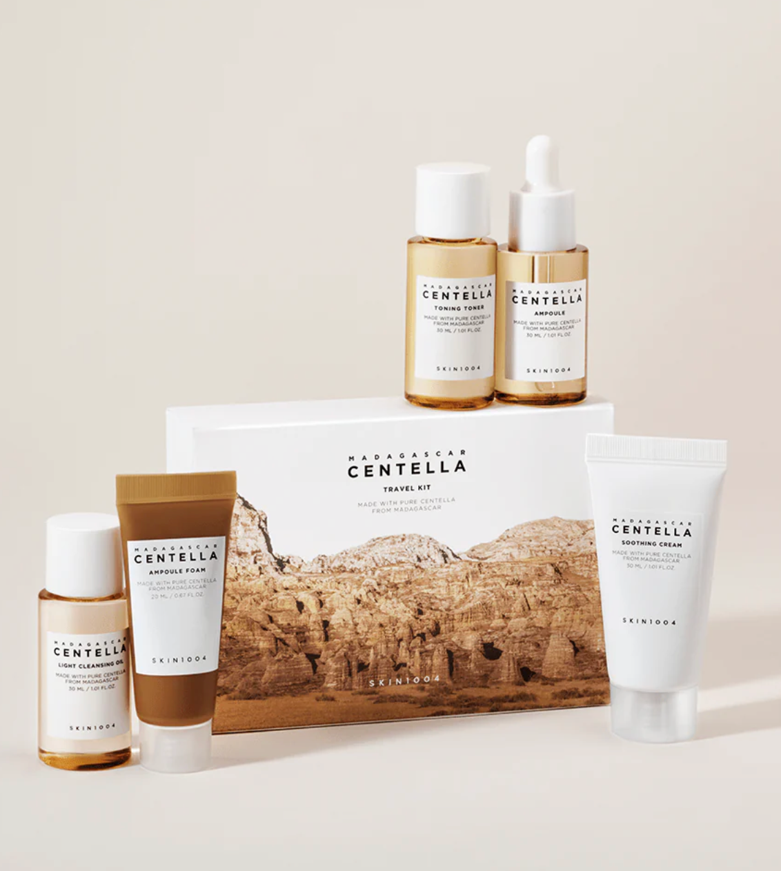 Un ensemble complet de routine de soins de la peau Centella avec 5 produits de taille mini pour les voyages. Ampoule de Centella L’ampoule signature de SKIN1004 (30ml) : offre des propriétés hydratantes, anti-inflammatoires, de renforcement des barrières, apaisantes et antioxydantes Toner tonifiant Centella (30ml) : toner exfoliant doux avec une texture légère et aqueuse Mousse à ampoule Centella (20ml) : un nettoyant riche et moussant avec le niveau de pH idéal de 5 élimine efficacement le maquillage et les impuretés sans dépouiller la peau Huile Nettoyante Légère Centella (30ml) : un nettoyant léger à base d’huile qui fait fondre en douceur le maquillage, la saleté, les huiles et la crème solaire sans piquer le contour des yeux Crème apaisante Centella (30ml) : – Un effet de refroidissement instantané soulage les rougeurs de la peau – Des soins apaisants puissants calment rapidement la peau sensible et renforcent la barrière cutanée – Contient 3 composants essentiaux pour raffermir la peau : le céramide, le cholestérol et les acides gras – Équilibre la peau endommagée avec le niveau de pH le plus proche d’une peau saine – Contient de la Centella asiatica hautement purifiée de Madagascar – Texture de gel hydratant non collante et légère qui coule en douceur sur la peau