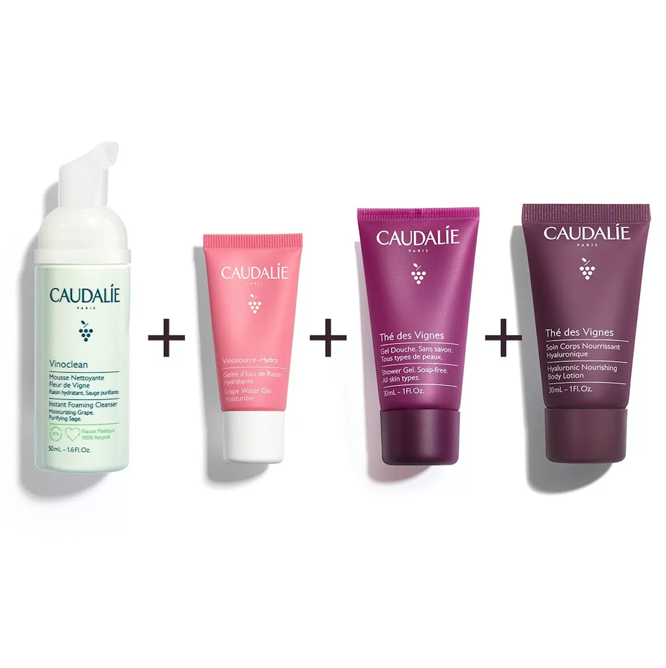 Coffret parfait à emporter en vacances! Contenant la mousse nettoyante Vinoclean (50ml), la gelée d’eau de raisin (15ml), le gel douche (30ml) et une crème hydratante corps (30ml).