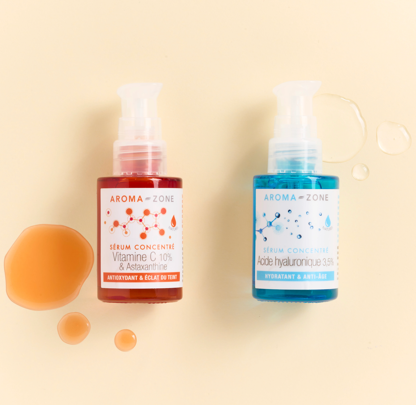 Sérum vitamine C et astaxanthine : Aqua, Ascorbyl glucoside (10%), Glycerin (glycérine végétale), Salix nigra bark extract (antimicrobien, extrait de saule noir), Sodium hydroxide (ajusteur de pH, pour obtenir un pH adapté à l’application cutanée), Sodium levulinate (conservateur naturel), Haematococcus Pluvialis Extract (astaxanthine, micro-algue rouge), Sodium hyaluronate (acide hyaluronique obtenu par biotechnologies), Simmondsia Chinensis Seed Oil (huile végétale de jojoba), Astragalus Gummifer Gum (gomme adragante, agent suspensif), Levulinic acid (conservateur natrel), Sodium anisate (conservateur naturel), Phytic Acid (sequestrant), Polypepsilon-Lysine (conservateur naturel), Tocopherol (vitamine E), Helianthus Annuus Seed Oil (huile végétale tournesol) Sérum acide hyaluronique : Aqua (​eau), Salix nigra bark extract (extrait d’écorce de saule noir), Sodium hyaluronate (acide hyaluronique, actif anti-âge d’origine naturelle), Glycerin (glycérine végétale BIO non dérivée d’huile de palme , hydratante), Levulinic acid (agent antimicrobien d’origine végétale), Sodium Levulinate (agent antimicrobien d’origine végétale)
