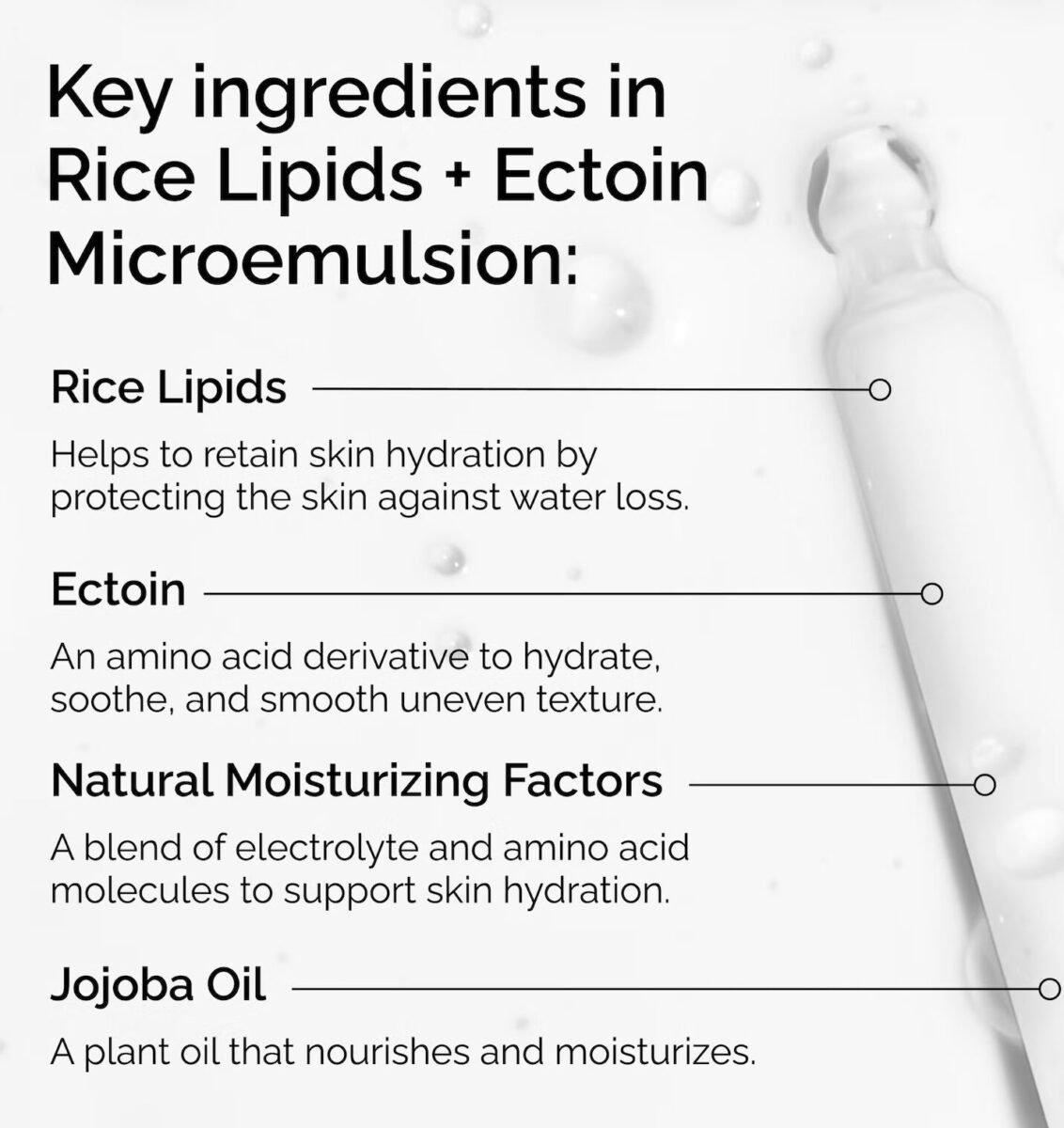 Rice Lipids + Ectoin Microemulsion est un hydratant ultra-léger conçu pour offrir une hydratation apaisante 24 heures sur 24 et une peau translucide et radieuse. La crème hydratante offre toute l’hydratation d’une crème riche dans un format le plus léger