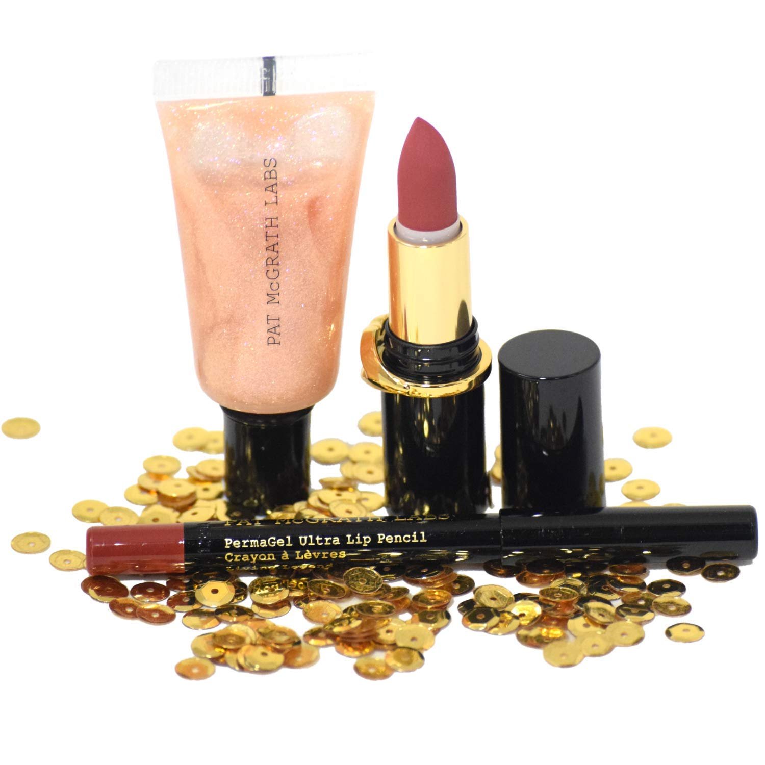 Trio de 3 minis produits lèvre de Pat Mc Grath. C’est une excellente marque de makeup!!! Très connu et d’excellente qualité. Ce trio comprends : – 1 mini crayon à lèvre en teinte rose des bois – 1 mini rouge à lèvre en teinte rose des bois – 1 mini gloss doré