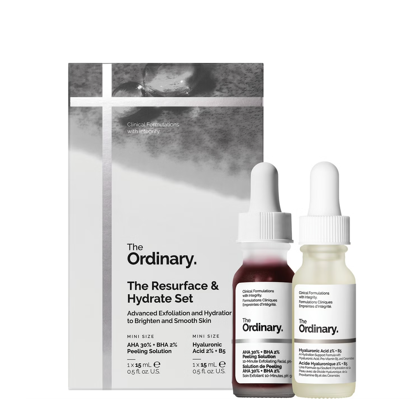 Le Set Régénération et Hydratation contient un duo complémentaire de formules offrant une exfoliation avancée et une hydratation durable en format miniature idéal pour les voyages.